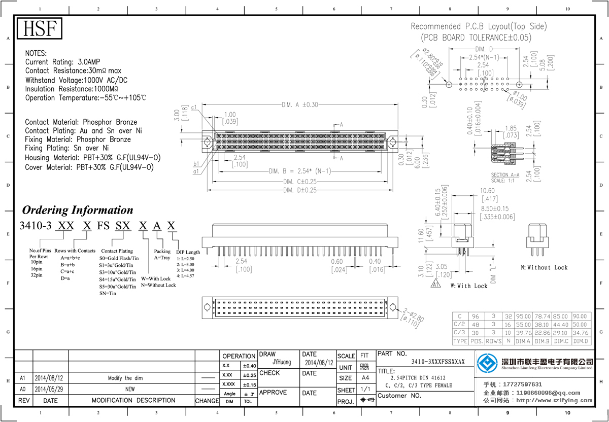 產(chǎn)品分類:DIN 41612連接器 產(chǎn)品型號(hào):HF DIN41612 母座 3*16P 180直插型 板對(duì)板連接 供應(yīng) 技術(shù)參數(shù):額定電流:3.0amp電流電阻:30m最大耐壓:1000V的交流/直流絕緣電阻:1000分鐘操作溫度: