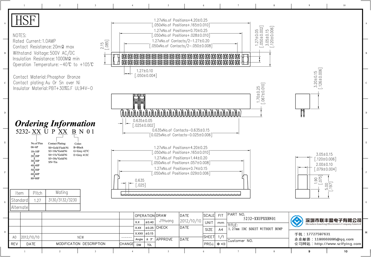產品分類:IDC插座連接器 產品型號:1.27*1.27MM U型 磷銅 IDC 帶凸點 聯豐盈生產 技術參數:額定電流:1.0amp電流電阻:20m最大絕緣電阻:1000mmin耐壓:1000V AC /分鐘工作溫度:40﹣℃+ 105℃