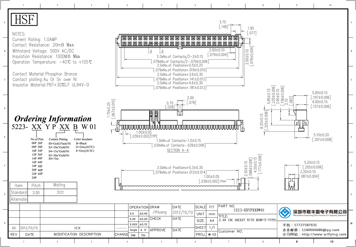 產(chǎn)品分類:IDC插座連接器 產(chǎn)品型號:UL認(rèn)證 IDC插座連接器 聯(lián)豐盈供應(yīng) 技術(shù)參數(shù):額定電流:1.0amp電流電阻:20m最大絕緣電阻:1000mmin耐壓:1000V AC /分鐘工作溫度:40﹣℃+ 105℃接觸材料