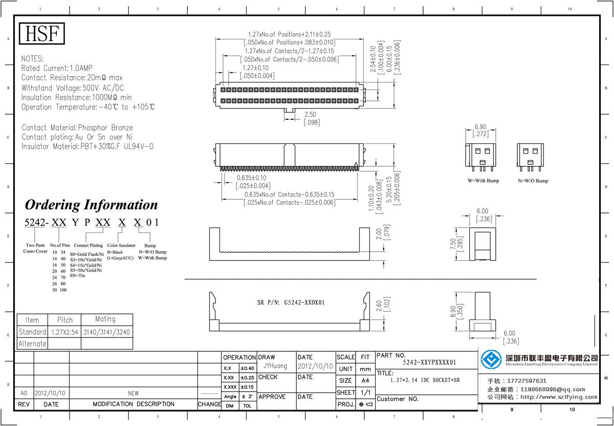產(chǎn)品分類:IDC插座連接器 產(chǎn)品型號(hào):1.27*2.54 二件式 彈片型 磷銅 IDC 帶凸點(diǎn) 技術(shù)參數(shù):額定電流:1.0amp電流電阻:20m最大絕緣電阻:1000m承受電壓:AC 500V /分鐘工作溫度:40﹣℃+ 105℃接