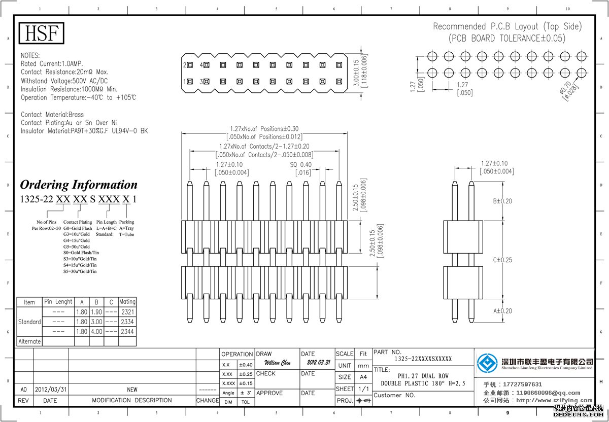 產(chǎn)品分類:排針連接器 產(chǎn)品規(guī)格:聯(lián)豐盈 1.27MM 雙層雙排 180DIP 排針 產(chǎn)品介紹:額定電流:1.0amp電流電阻:20m最大絕緣電阻:1000m民承受電壓:AC 500V /分鐘工作溫度:40﹣℃+ 105℃接觸材
