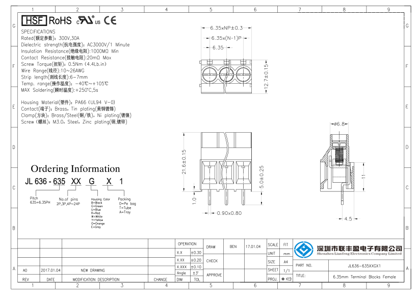 產(chǎn)品分類(lèi):接線端子 產(chǎn)品型號(hào):螺釘式PCB接線端子 間距6.35mm 詳細(xì)型號(hào):螺釘式PCB接線端子-JL636,間距6.35mm,CE認(rèn)證,UL證書(shū) 產(chǎn)品介紹:材質(zhì)電鍍(MATERIAL) , 螺絲(Screw)M2.0,鋼,鍍鋅