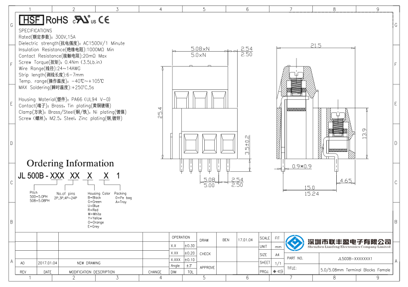 產(chǎn)品分類:接線端子 產(chǎn)品型號:PCB接線端子 間距5.00/5.08mm 詳細型號:螺釘式PCB接線端子-JL500B,間距5.00/5.08mm,CE認證,UL證書 產(chǎn)品介紹:材質(zhì)電鍍(MATERIAL) , 螺絲(Screw)M2.0,鋼,鍍鋅