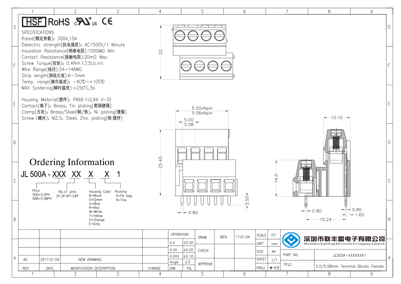 產(chǎn)品分類:接線端子 產(chǎn)品型號(hào):螺釘式PCB接線端子 間距5.00/5.08mm 詳細(xì)型號(hào):螺釘式PCB接線端子-JL500A,間距5.00/5.08mm,CE認(rèn)證,UL證書(shū) 產(chǎn)品介紹:材質(zhì)電鍍(MATERIAL) , 螺絲(Screw)M2.0,鋼