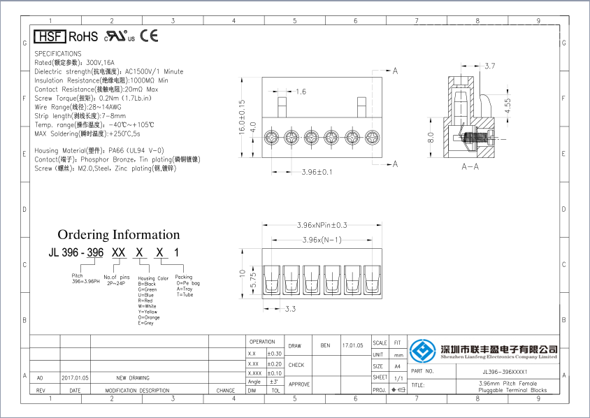 產(chǎn)品分類:接線端子 產(chǎn)品型號(hào):插拔式接線端子-JL396,間距3.96mm 詳細(xì)型號(hào):插拔式接線端子-JL396,間距3.96mm,CE認(rèn)證,UL證書 產(chǎn)品介紹:材質(zhì)電鍍(MATERIAL) , 螺絲(Screw)M2.0,鋼,鍍鋅