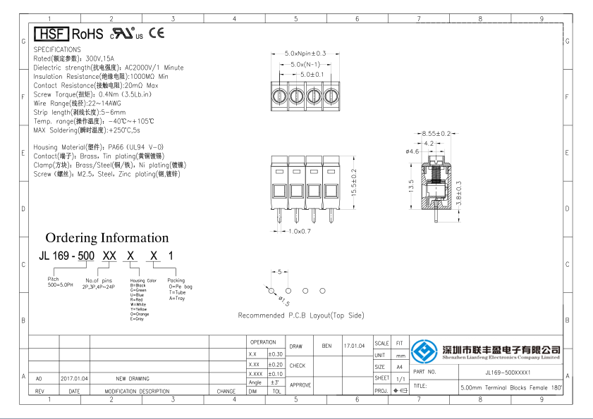 產(chǎn)品分類:接線端子 產(chǎn)品型號(hào):螺釘式PCB接線端子 間距5.00mm 詳細(xì)型號(hào):螺釘式PCB接線端子-JL169,間距5.00mm,CE認(rèn)證,UL證書 產(chǎn)品介紹:材質(zhì)電鍍(MATERIAL) , 螺絲(Screw)M2.0,鋼,鍍鋅
