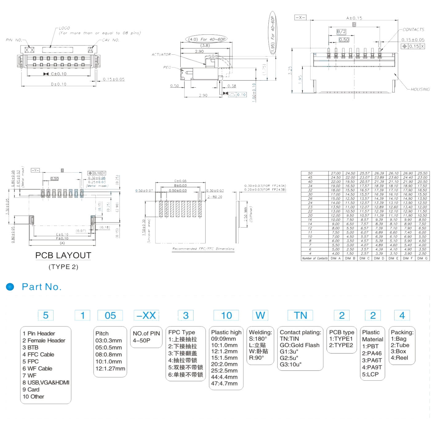 產(chǎn)品類型 FPC0.5-XP間距 0.5mm H1.0 后翻