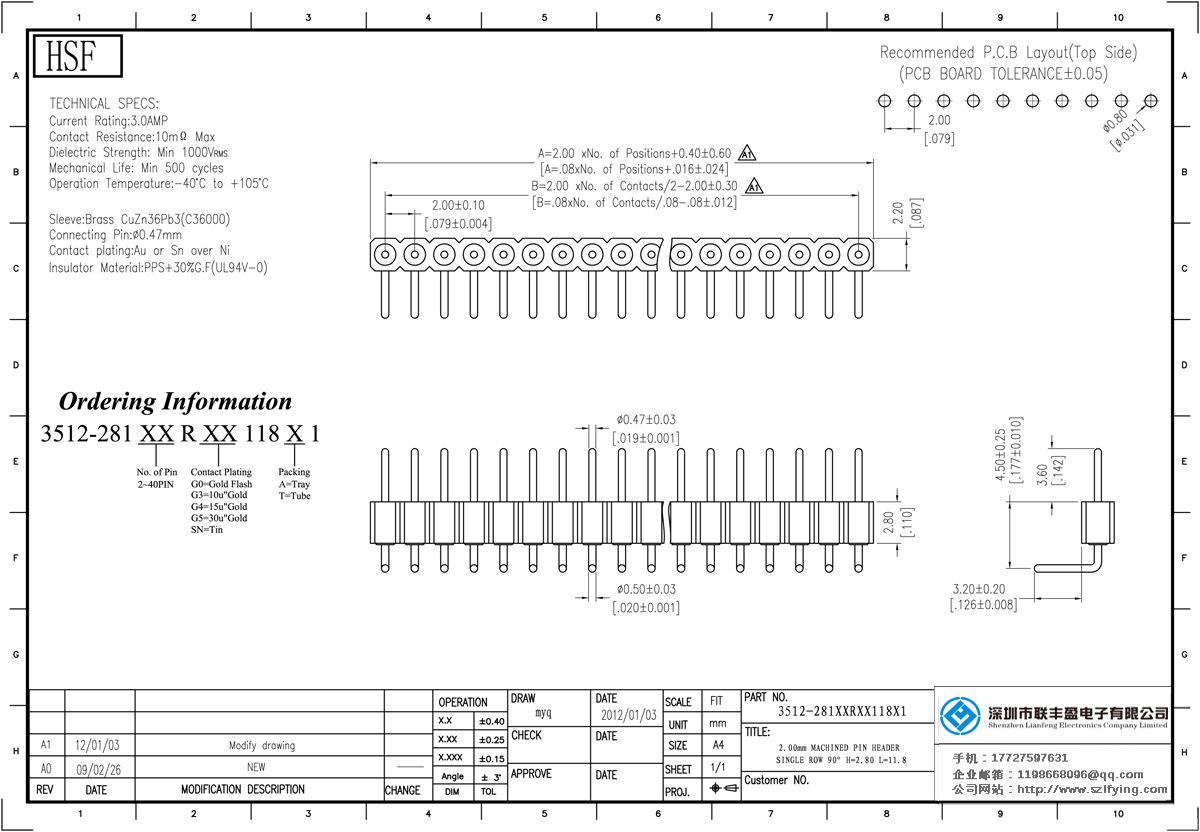 產(chǎn)品分類:圓孔排針排母連接器 產(chǎn)品型號:聯(lián)豐盈 2.0MM 單排 H=2.8 R/A 圓型排針 技術參數(shù):額定電流:3.oamp接觸電阻:1om最大介電強度:MIN1000vrms機械壽命:最少500次交配引腳:0.400.66mm或