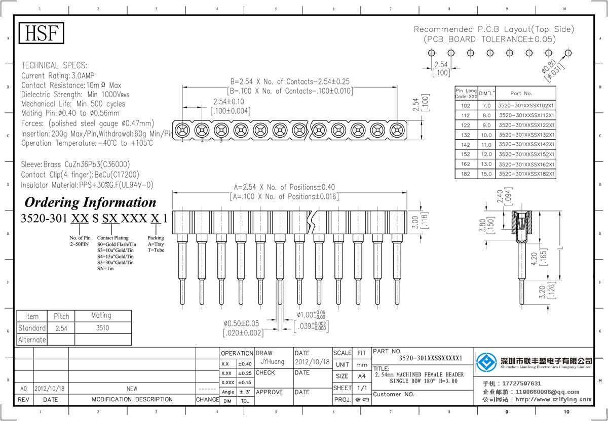 產品分類:圓孔排針排母連接器 產品型號:2.54MM 單排 S/T 端子長:10.3MM 圓孔排母 生產 技術參數:額定電流:3.oamp接觸電阻:1om最大介電強度:MIN 1000vrms機械壽命:最少500次交配銷:0