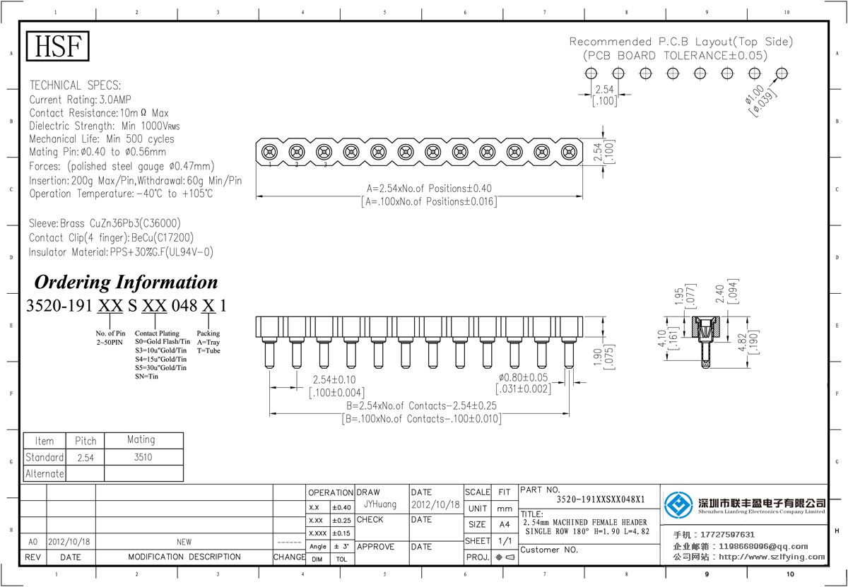產(chǎn)品分類:圓孔排針排母連接器 產(chǎn)品型號:聯(lián)豐盈 2.54MM H=1.9 單排 直插型 圓型排針 技術參數(shù):1.oamp接觸電阻:LOM最大介電強度:MIN 1000vrms機械壽命:500分鐘周期運行溫度:40℃+ 105℃套
