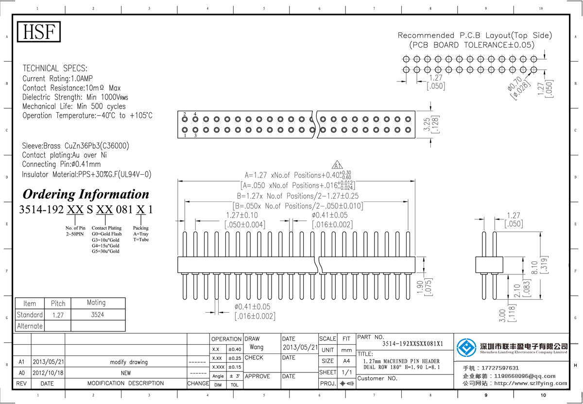 產(chǎn)品分類:圓孔排針排母連接器 產(chǎn)品型號:聯(lián)豐盈 1.27MM H=1.9 雙排 直插型 圓型排針 供應(yīng) 技術(shù)參數(shù):額定電流:1.0amp接觸電阻:10m0 Max Dielectric強(qiáng)度:MIN 500vrm5機(jī)械壽命:最少500次交配銷