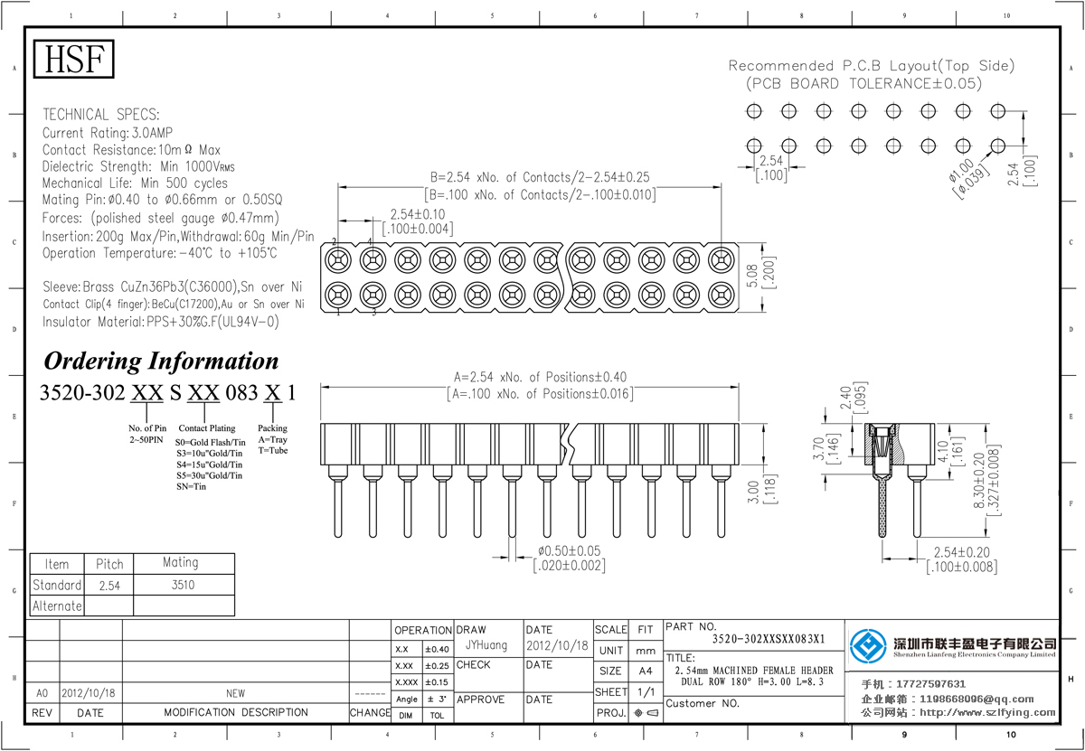 產(chǎn)品分類:圓孔排針排母連接器 產(chǎn)品型號:聯(lián)豐盈 2.54MM 雙排 圓孔排母 廠家 技術(shù)參數(shù):額定電流:3.oamp接觸電阻:1om最大介電強(qiáng)度:MIN 1000vrms機(jī)械壽命:最少500次交配引腳:0.70.9mm或