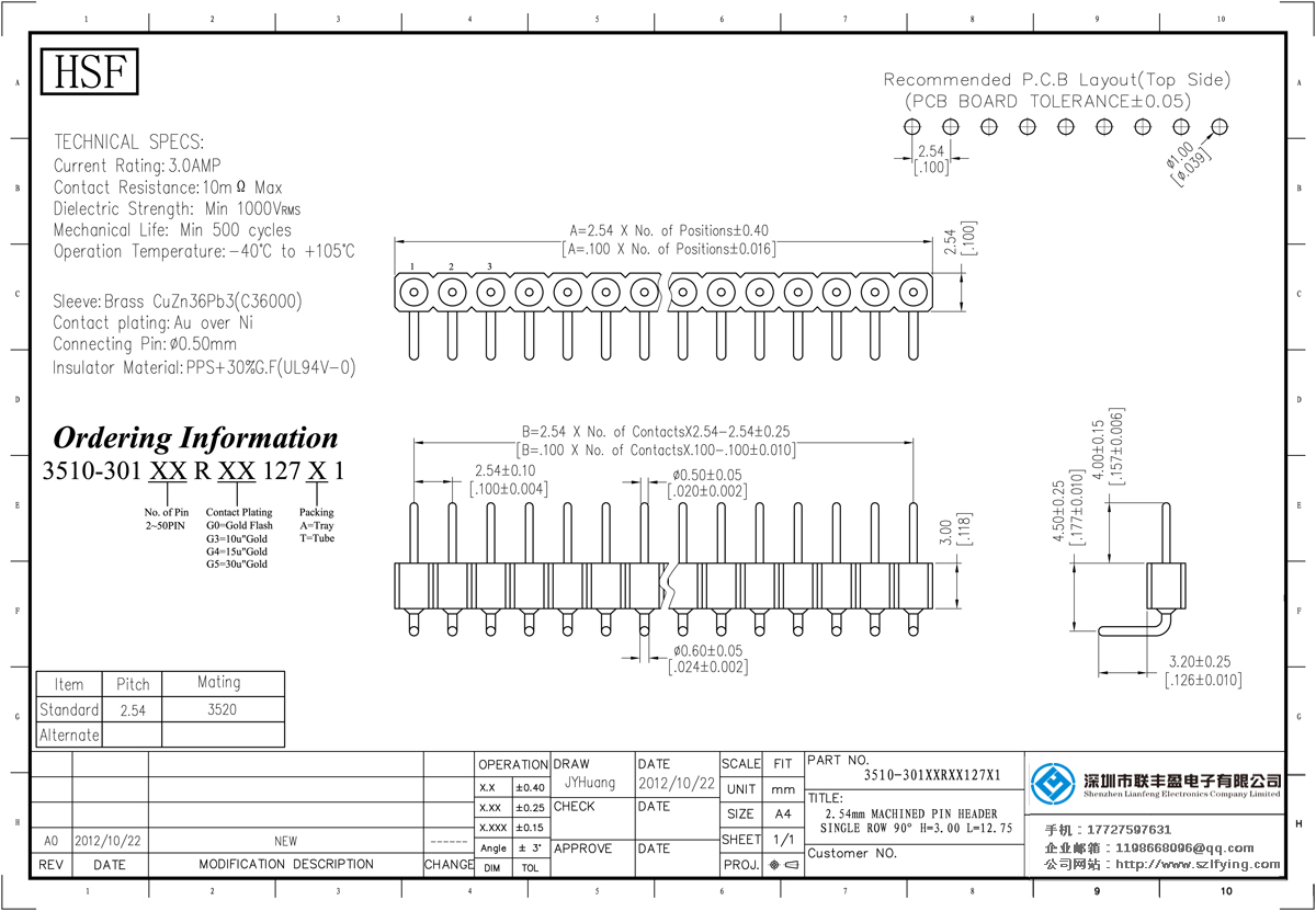 產(chǎn)品分類(lèi):圓孔排針排母連接器 產(chǎn)品型號(hào):聯(lián)豐盈 2.54MM 單排 H=3.0 R/A 圓型排針 技術(shù)參數(shù):額定電流:3.oamp接觸電阻:1om最大介電強(qiáng)度:MIN 1000vrms機(jī)械壽命:最少500次交配引腳:0.70.9mm或