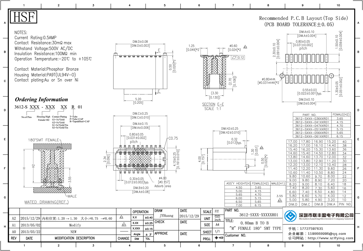 產(chǎn)品分類:Board To Board 連接器 產(chǎn)品型號:0.8MM 母座 單槽結(jié)構(gòu) Board To Board聯(lián)豐盈 技術(shù)參數(shù):額定電流:0.5amp電流電阻:20m最大絕緣電阻:100m承受電壓:AC 500V /分鐘工作溫度:20﹣℃+ 1