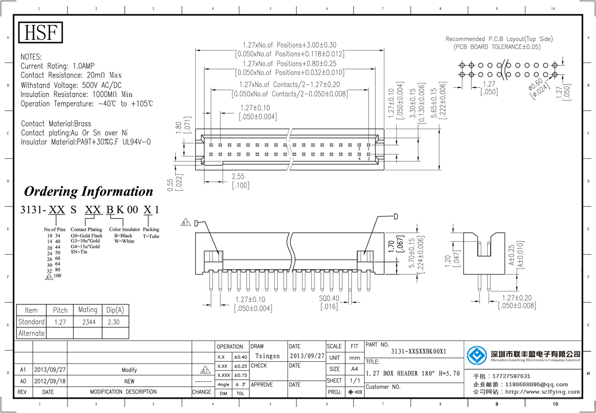 產(chǎn)品分類:簡易牛角連接器 產(chǎn)品型號:聯(lián)豐盈 1.27MM H=5.7 2*10p 180DIP ,滿PIN 簡牛 技術(shù)參數(shù):額定電流:1.0amp電流電阻:20m最大承受電壓:500V的交流/直流絕緣電阻:1000分鐘操作溫度: